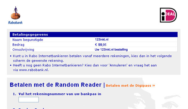 Met iDeal kunt u vertrouwd, veilig en gemakkelijk uw online aankopen bij 123-3D.nl afrekenen. U rekent af in uw vertrouwde internet betaalomgeving, op basis van specifieke beveiligingsmethodes van uw eigen bank. Als internetbankierder kunt u direct gebruik maken van iDEAL, zonder dat u zich daarvoor hoeft aan te melden.